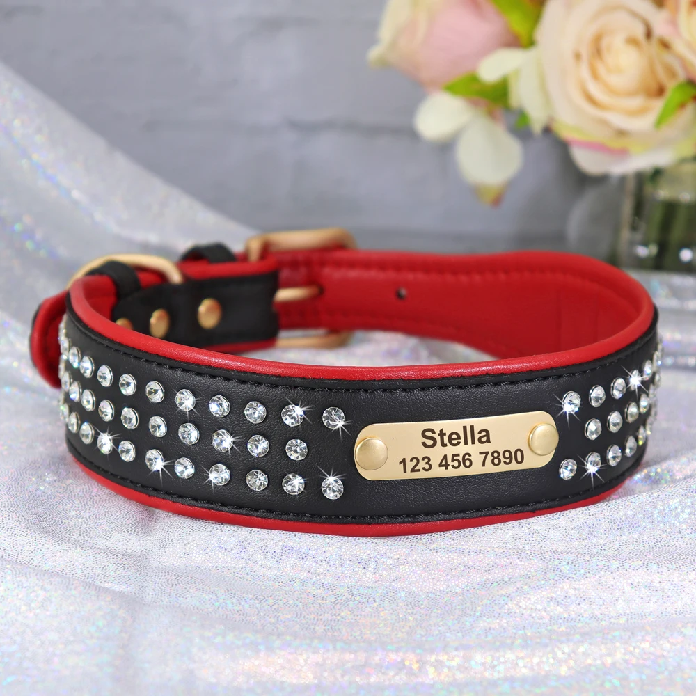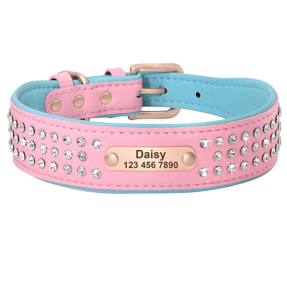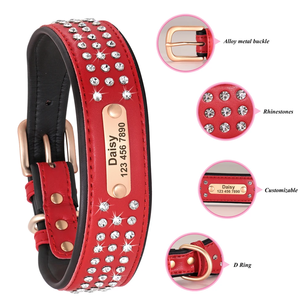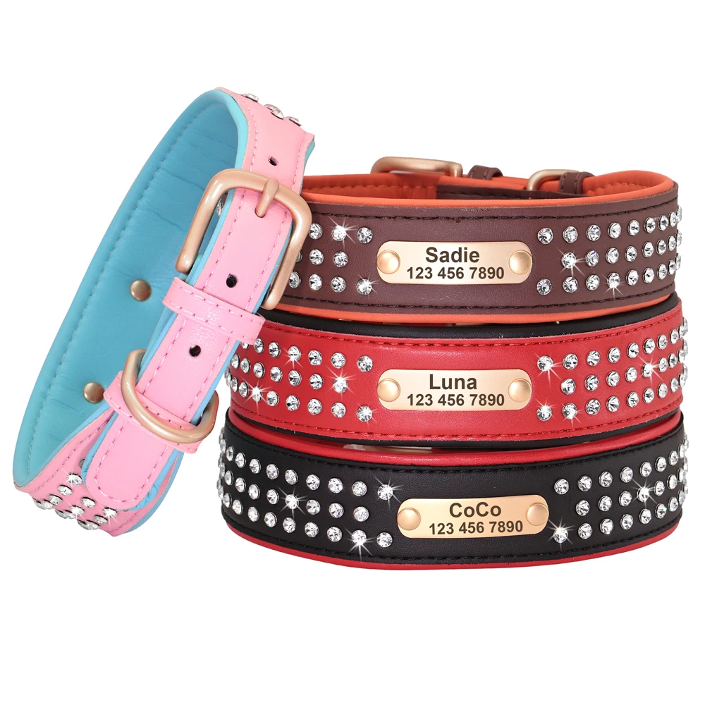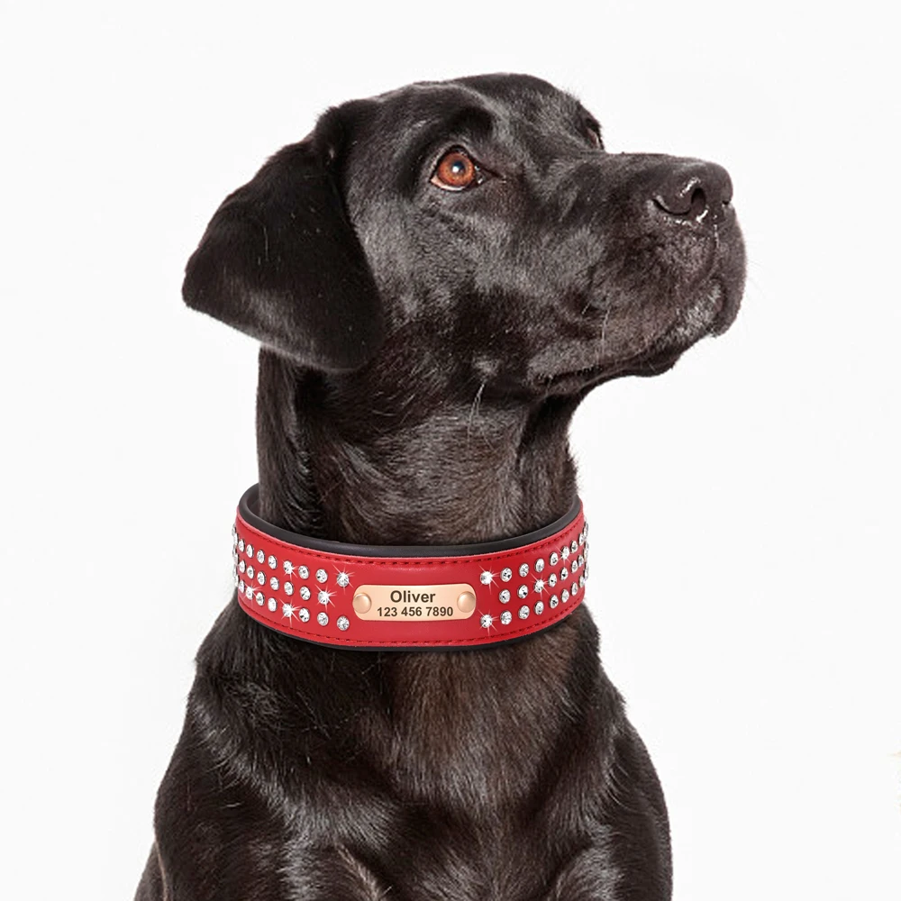 Custom Leather Dog Collar Bling Rhinestone Big Dog Collars Soft Padded Pet Necklace With Engraved ID Tag For Medium Large Dogs