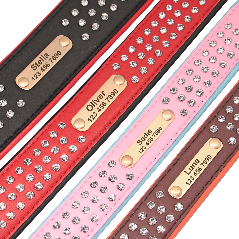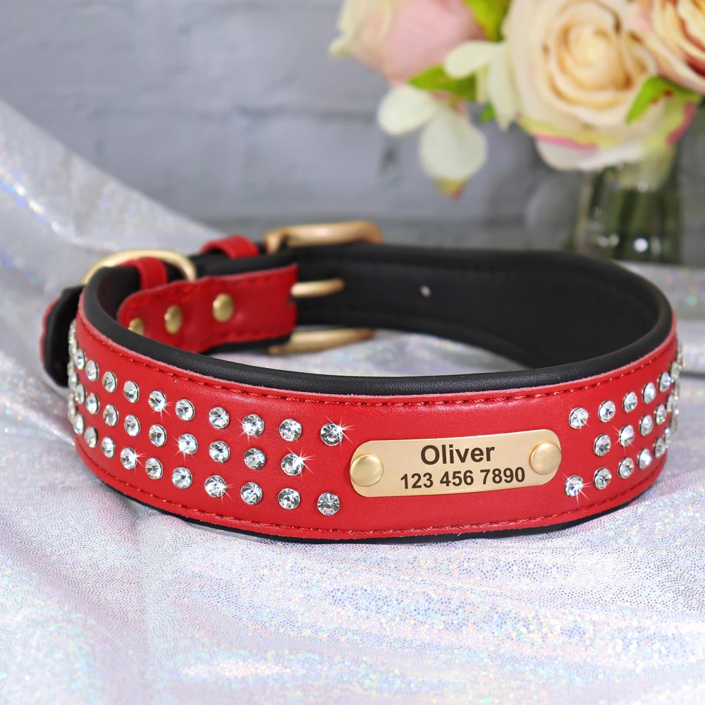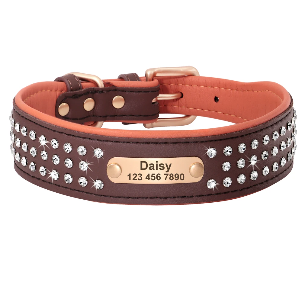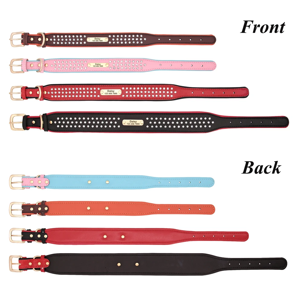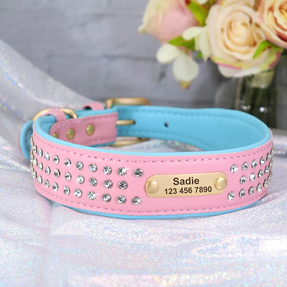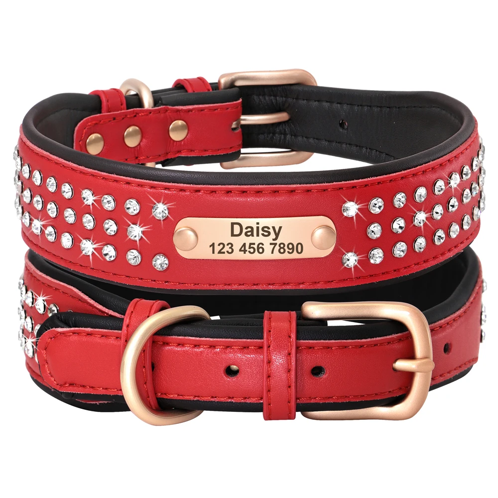 Custom Leather Dog Collar Bling Rhinestone Big Dog Collars Soft Padded Pet Necklace With Engraved ID Tag For Medium Large Dogs