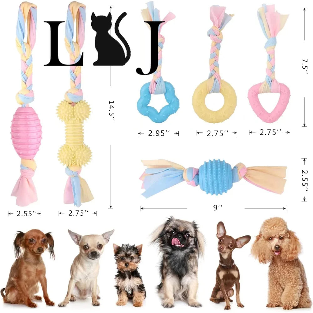 *10 different puppy toys, Including dog rope toys, dog balls, dog bones, puppy teething rings and so on. Different shapes and bright colors make it impossible for any puppy to refuse. Dog toys for puppies, small dogs, and medium dogs.